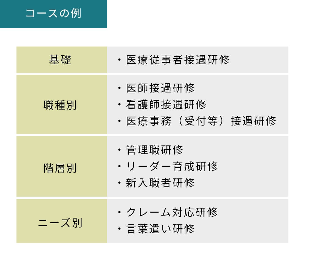 接遇の基本、ホスピタリティ、コミュニケーションなどのカリキュラムメニューから、貴院の課題やご要望に応じて最適なオリジナルカリキュラムを作成します。